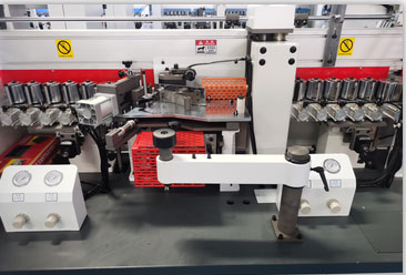 6輪壓貼貼合比4輪更精密,膠線輕微不跑帶,貼合牢靠,厚薄木皮均可輕松走帶,氣缸控制開關(guān)膠門,膠量穩(wěn)定,厚薄均勻。 |